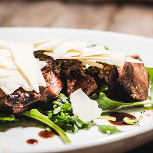 Tagliata di manzo con rucola, grana e aceto balsamico